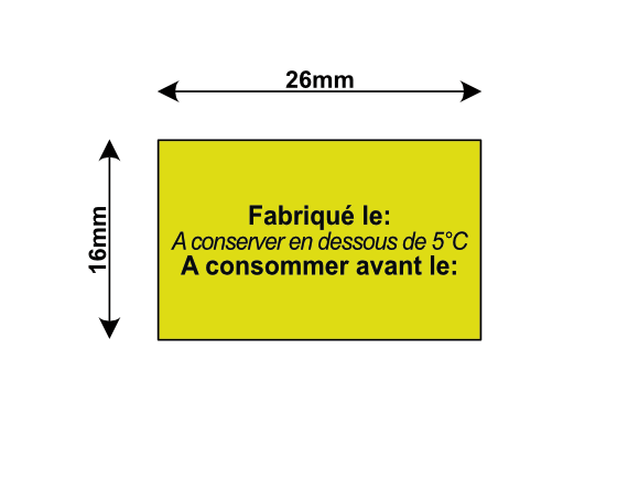 26x16mm avec pré-impression "Fabriqué le: / A conserver en dessous de 5°C / A consommer avant le:" surgelée