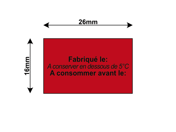 26x16mm avec pré-impression "Fabriqué le: / A conserver en dessous de 5°C / A consommer avant le:" surgelée